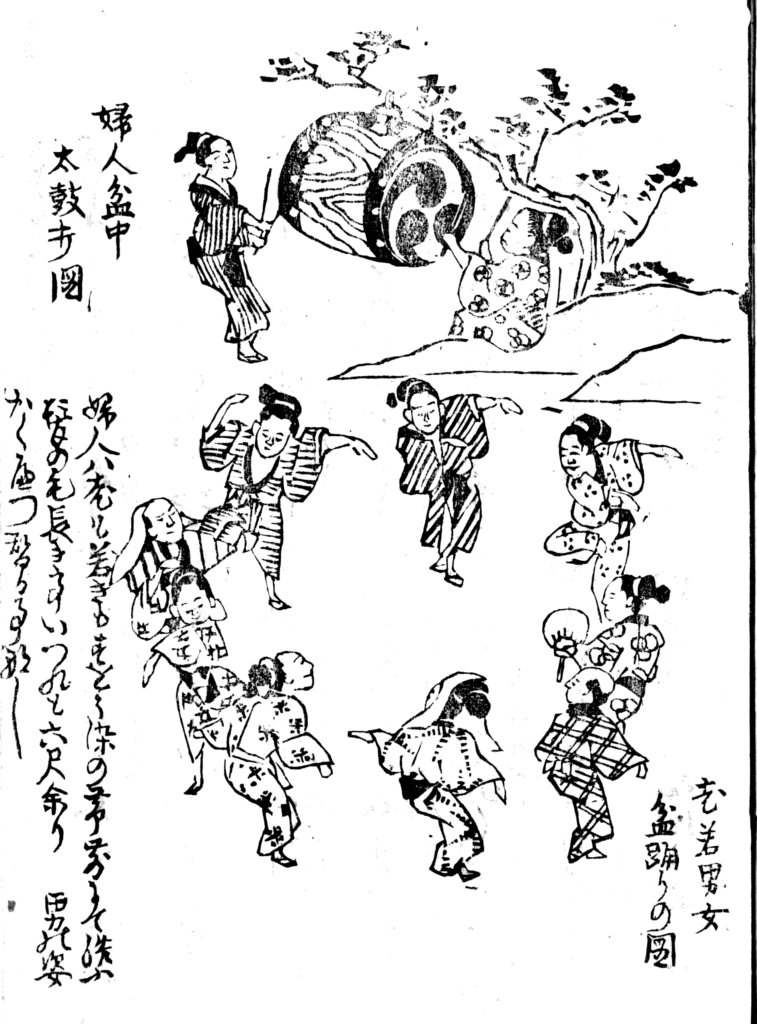 『絵入八丈土産』では盆踊りの唄の演目名が列挙され、その中で娘たちが太鼓を打ち囃したと記されています。『寐さめ草』でも、太鼓の記述は盆踊りの場面の中にあり、「つがる」という唄の拍子として太鼓が使われています。