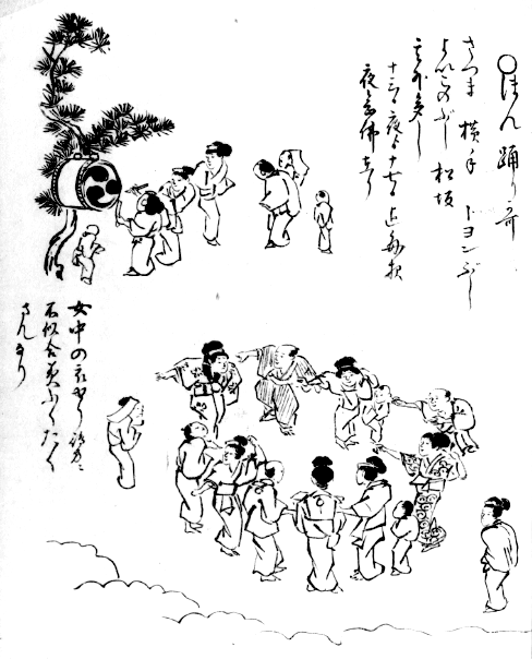 盆踊りの唄として「さつま・横手・とよんぶし・よいこのぶし(=よしこの節)・松坂」が記録されており、「十三日夜より十七日迄毎夜」踊りが行われていたと記されています。絵には、松の木に吊るされた太鼓を叩く人物と、輪になって踊る人々が描かれています。
