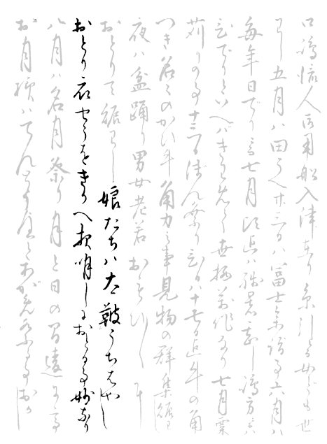 「娘たちは太鼓うちはやし おどり衣装をきかえ 夜明しにおどる事妙なり」